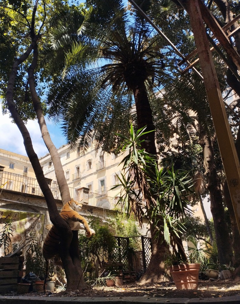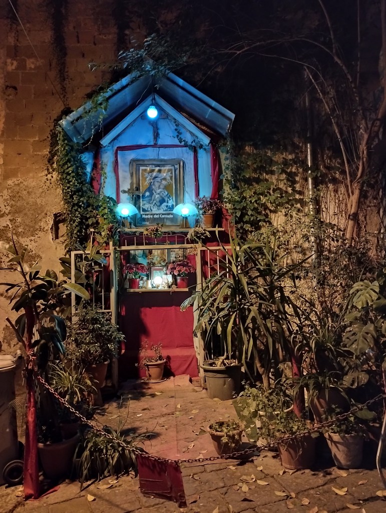 Das war wenige Nächte vor Vollmond. Ich ging stundenlang allein durch die Altstadt von Neapel und umso länger ich ging, umso mehr fühlte ich mich, als würde ich träumen. Gibt es etwas Schöneres als die Schlucht der engen Gassen mit all ihren Balkonen, Ornamenten, Stofffetzen, Wäscheleinen und dazwischen, klar und rund und strahlend, der Mond? Ich wurde so friedlich. Ein paar leichte Wortwechsel mit Fremden, ausgetauschte Blicke, der alte Bettler mit dem warmen Lächeln, dem ich heute zum ersten Mal Geld gebe und der mich mit “Ciao, principessa” verabschiedet, ein erleuchtetes Marienheiligtum, eine Katze, die in einem Schaufenster mit der Dekoration spielt. So vieles, was es wert ist, angeschaut zu werden, ohne es zu verstehen oder etwas darüber zu denken.