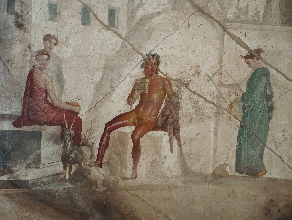 Siccome me ne ero appena ricordata e lui mi sembrava molto intelligente, gli ho chiesto di che cosa si trattasse quelle maschere che spesso si trovano in giro sul bordo di qualche proiezione murale nelle scene rappresentate nei quadri del museo. È una maschera barbuta con enormi orbite e un’espressione folle. „È la maschera del satiro“, ha detto, „che fa in modo che le feste si intensifichino e degenerino nel caos“.